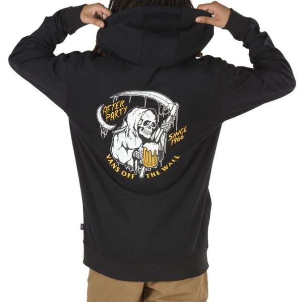The After Party Pullover Hoodie is a 60% cotton, 40% polyester fleece pullover hooded sweatshirt with a front pouch pocket and skull graphics at the left chest and back. Model is 6 feet tall and wearing a size Medium.