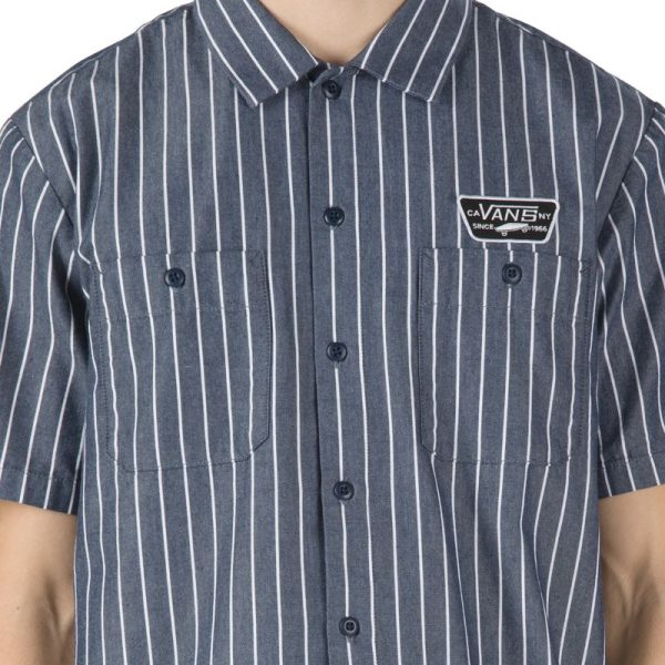 The Coleman Buttondown Shirt is a 65% cotton, 35% polyester buttondown shirt with short sleeves and a workwear silhouette. It also includes a yarn dye, vertical stripes, and chest pockets. Model is 6 feet tall and wearing a size Medium.