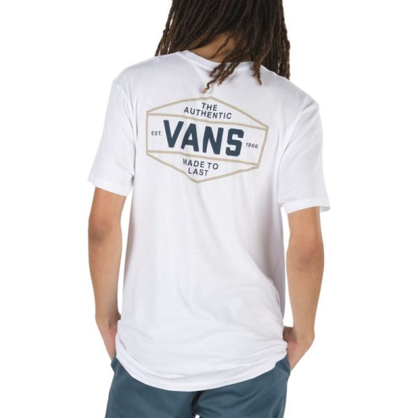 The Vans Standard Short Sleeve T-Shirt is a 100% combed ringspun cotton t-shirt with graphics at the left chest and back. Fit type: slim. Model is 6 feet tall and wearing a size Medium.