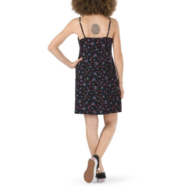The Mandi Cami Dress is a 100% viscose spaghetti strap dress with an allover floral print, adjustable straps, a hidden zipper, and a square neckline. Model is 5 feet 9 inches tall and wearing a size Small.