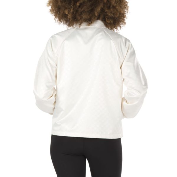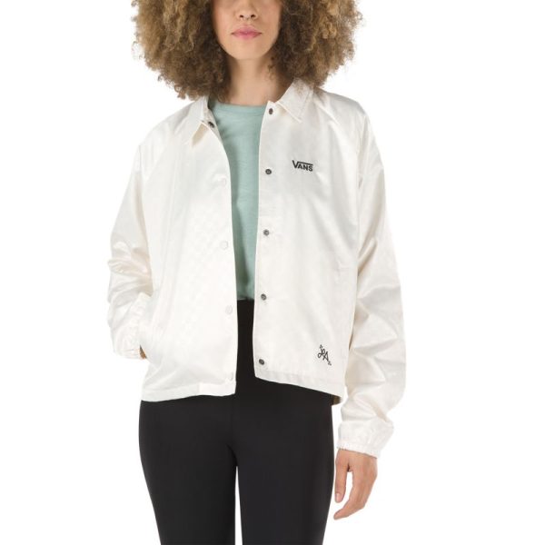 Lizzie Armanto is a down-to-earth, fashion-forward, barrier-breaking definition of Girl Power! She travels the world spreading the stoke of skateboarding and empowering youth culture of all forms. This season, Vans has teamed up with Lizzie to create a collection celebrating her creativity with an assortment of apparel and footwear as unique as she is. Made with 100% polyester embossed satin, the Heart Lizzie Coaches Jacket features an allover checkerboard design, snap-front closure, and interior lining. It also includes welt pockets, logo embroidery at the chest and sweep, graphics at the chest interior, and a cropped fit. We love Lizzie! Model is 5 feet 9 inches tall and wearing a size Small.