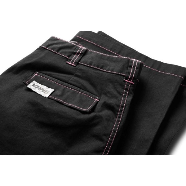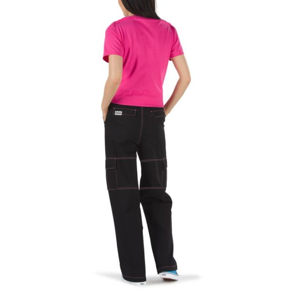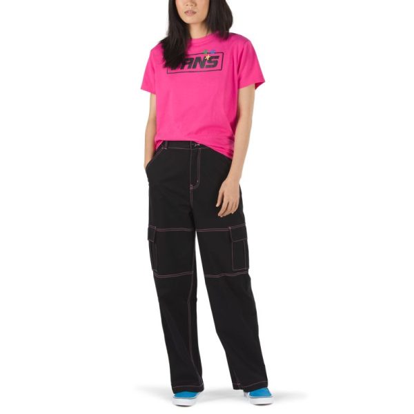 Inspired by the skateboarding community and the effortless style of the Vans skate team, this seasonal apparel and footwear collection blends fashion-forward design with street sensibility. Whether its through skateboarding, music, art, or fashion, Vans encourages people to express their creativity and build communities around it. The Thread It Cargo Pant is a 64% cotton, 34% polyester, and 2% elastane stretch twill high-waisted cargo pant with back slash pockets, pop contrast stitching, a novelty logo clamp label at the back pocket, and a relaxed fit. Model is 5 feet 9 inches tall, has a 23-inch waist, and is wearing a size 26.