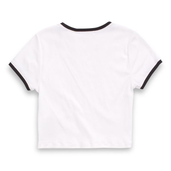 The Grunge Glam Baby T-Shirt is a 100% cotton ribbed baby tee with a scoop neck, contrast binding at the neck, and logo embroidery at the chest. Model is 5 feet 9 inches tall and wearing a size Small.