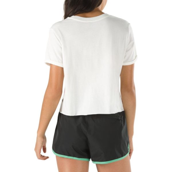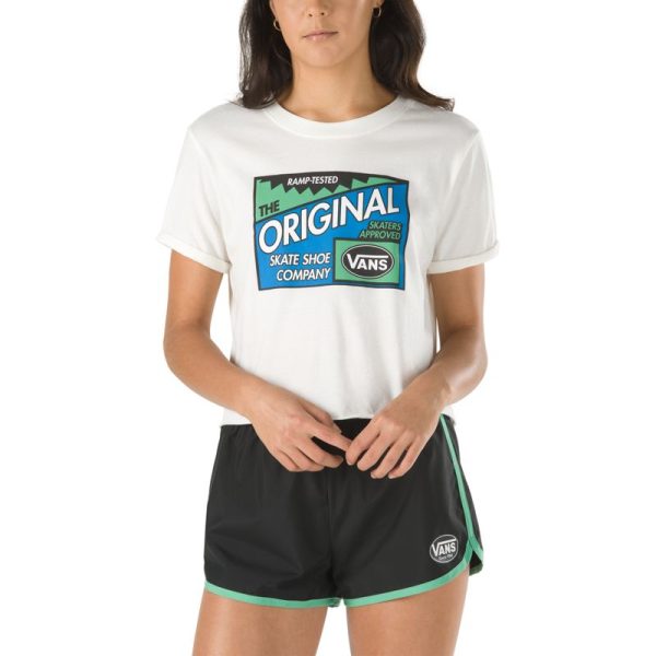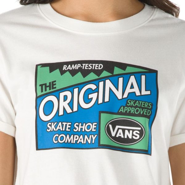 The Ramp Tested Roll Out T-Shirt is a 100% cotton jersey boxy tee with rolled sleeves and a vintage screen print at the front. Model is 5 feet 9 inches tall and wearing a size Small.