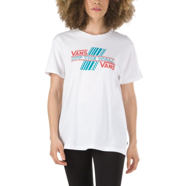 The Rider Tri Boyfriend T-Shirt is a heavy 100% cotton jersey boyfriend tee with front graphics. Model is 5 feet 9 inches tall and wearing a size Small.
