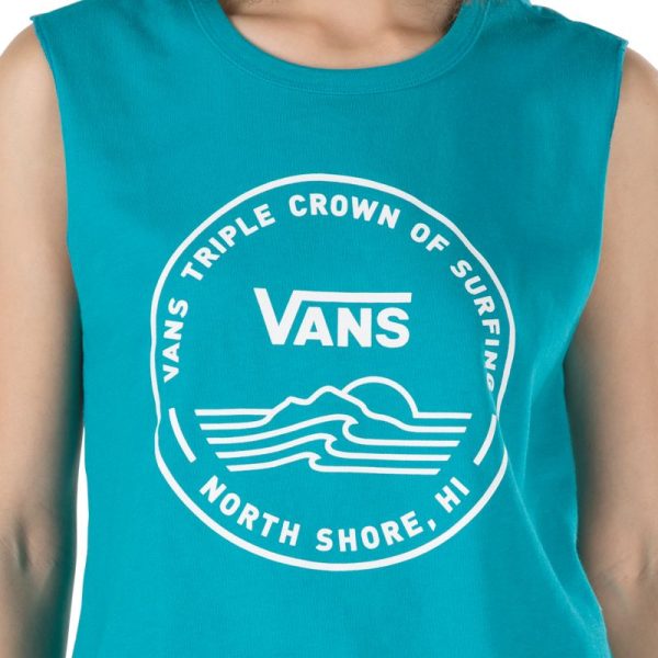 The 2020 VTCS Logo Muscle Tank is a heavy 100% cotton jersey overlock muscle tank top featuring 2020 Vans Triple Crown of Surfing graphics at the front and back neck. Model is 5 feet 9 inches tall and wearing a size Small.
